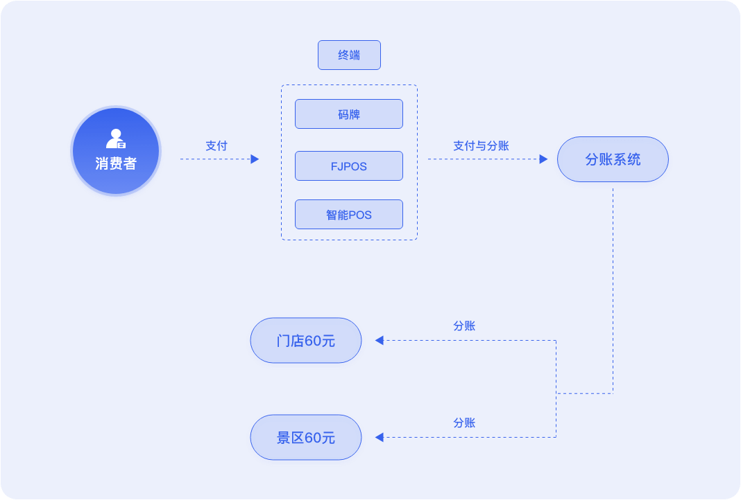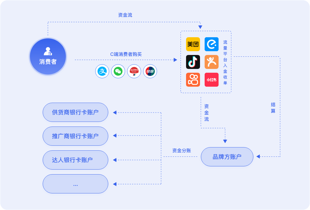 采用H5页面或小程序收款,收款经分账系统,先进入银行备付金账户中,再向各供应商 及合作伙伴分账后,剩下利润进入企 业公户或个人卡。